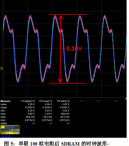 下图5所示为只串联100欧电阻时测量到的波形,信号有过冲,峰峰值为5.35V,偏大,对比图4的端接方法,串联电阻加上并联电容是较好的解决方法。