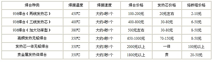 根据焊接的产品质量和工作效率及发热芯、烙铁头(烙铁咀)的价格,优先推选高频发热无铅焊台,第二推选936焊台(加大功率型)。