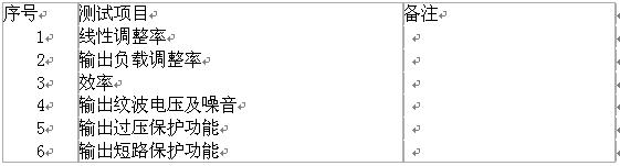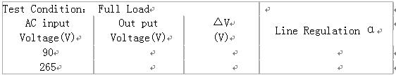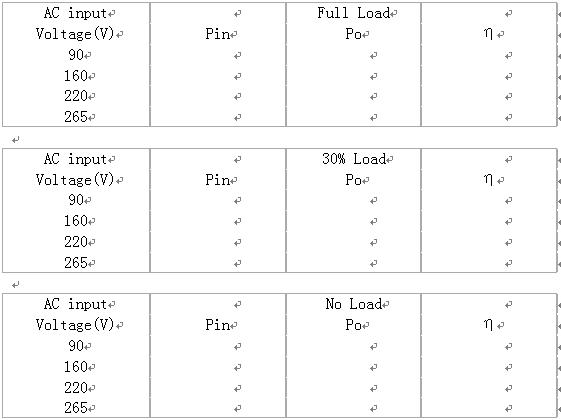 (1)交流输入电压90V,160V,220V,265V,输出电流为100%Io,30%Io,空载时,测出对应的稳定的直流输出电压值Uo与对应的交流输入功率Pin。