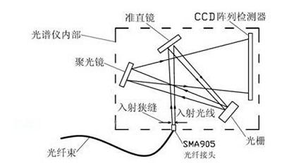 光谱仪微型化设计的实现得益于摄谱结构,最初的光学平台采用对称式Czerny-Turner分光结构[8],荷兰Avantes公司生产的微小型光纤光谱仪即使用了这种光学平台设计(图1所示)。光信号由光纤传导经过一个标准的SMA905接口进入光谱仪内部,经球面镜准直,然后由一块平面光栅分光后,将入射光分成按一定波长顺序排列的单色光,再由聚焦镜聚焦到一维线性CCD线性阵列探测器上进行检测。
