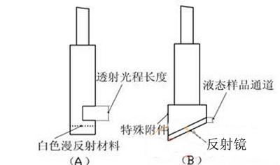 图4-A是透射式浸入探头,在探头末端有一段1mm、2.5mm或5mm的缺口,光通过此物理间隙由底部的白色漫反射材料反射回连接到光谱仪的光纤,信号进入仪器内进行检测。通过把探头浸入或固定在液体中,可在线测量吸收率。图4-B是工业用荧光探头,它在反射式探头末端加装特殊的附件,变为一个45。角的前端视窗,该附件可有效防止周围环境光进入探头,并屏蔽激发光来增强荧光信号。被测液体光程还可在0-5mm之间调节。