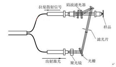 由于拉曼散射信号较弱,受干扰影响大,故用于拉曼光谱测量的光纤探头光路设计较为特别(图5所示)。