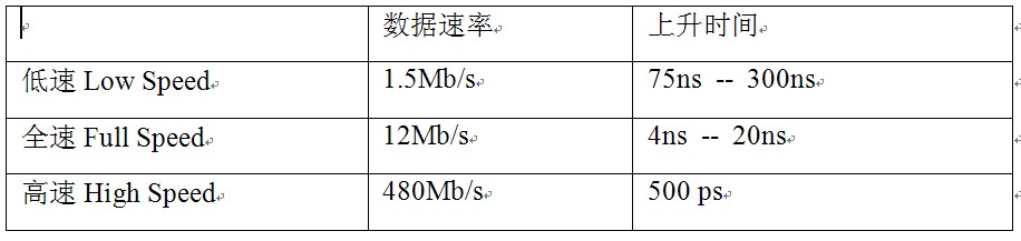 USB2.0是一种4线串行系统,包括VBus,D-,D+和地线,D-和D+是数据传输线,VBus和地线传输5V电压。按照功能的不同,USB2.0产品可分为主机(Host)、设备(Device)和集线器(Hub)三大类。还可以根据供电方式的不同将USB2.0设备分为总线供电(从主机汲取电流)和自供电两种方式。为了适应不同类型应用对数据传输速度的要求,USB2.0定义了三种速率级别,分别是: