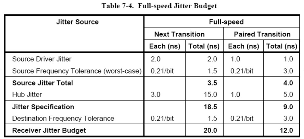 USB2.0是一种复杂的总线结构,既包括高速、全速、低速三种速率级别,也包括主机、设备、集线器三类产品,每种类别又包括多个参数需要测试,幅度、抖动、时序、过程等特性都需要一一分析是否满足规范要求。USB2.0一致性测试规范对HighSpeed的Device分析就定义了几十个参数。每一种参数的测量对于示波器的使用都定义了设置参数,如下1就是USB-IF对全速抖动测试的容限范围规定: