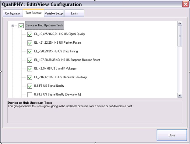 QualiPHY软件支持用户可定制化测试项目,可以选择单个或多个项目分别测试,从而大大提高了灵活性。图2描述的是USB2.0 High Speed的Device or Hub测试项目定制窗口。