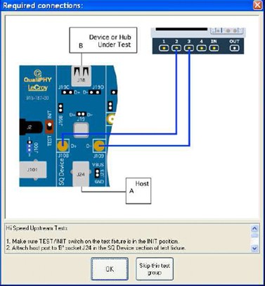 QualiPHY软件的用户界面设计非常人性化和直观实用,它会以图表化的方式显示出一致性测试的每个环节中测试夹具、示波器主机和DUT三者之间的拓扑关系,使用者无需记忆,就能正确设置测试环境。下图4清晰 显示了USB2.0高速设备信号质量测试中的夹具、DUT和示波器连接关系。
