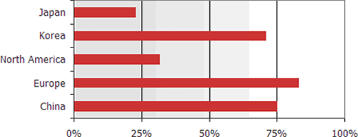 DisplaySearch研究指出,不同地区市场的电视性能有显著的差异。例如在待机能耗的部份,日本电视要求在0.3瓦特以下,欧洲电视则在0.5瓦特以下,然而在北美,即便是经过能源之星(Energy Star)认证的电视,待机时消耗功率仍维持在0.5到0.6瓦特之间。Paul Gray补充说:“实际上我们发现在北美仍有许多电视待机时消耗功率超过1瓦特。如果其它地区能如加州一样倡导电力节省,将可以同时节省消费者的荷包。”