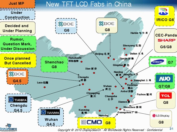 市场方面,随着面板价格上扬、终端销售成绩比预期理想、中国家电下乡及以旧换新政策的实施等,整个FPD产业景气似乎已然复苏,天马、夏普、三星、LG等厂商陆续开始在大陆建立新生产线或重新启动停产产能。