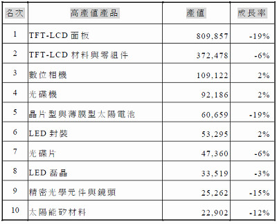 2009年台湾地区1兆7,247亿新台币的光电产值约相当522亿美元,拥有16%的全球市场占有率。台湾地区有几项产品的世界占有率仍能维持全球前三大,包括LED芯片、LED封装、TFT LCD材料与零组件、TFT LCD面板、数字相机代工、光驱与光盘片,和光学镜片,以及结晶硅太阳电池等。与往年类似,这十大产品即占有台湾地区整体光电产值的94%比例。