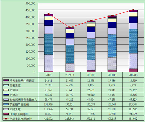 根据光电科技工业协进会(PIDA)的分析,2009年全球光电市场持续受到全球金融风暴的影响,又从2008年的4,220亿美元,大幅衰退了23%,跌到3,235亿美元,可谓创下有史以来最大的跌幅;更甚于1997年的亚洲金融风暴和2000年的通讯市场泡沫化。预期全球光电市场将会于2010年反弹,成长16%;亦高于以往的成长率,然后再以10%左右逐年回升。