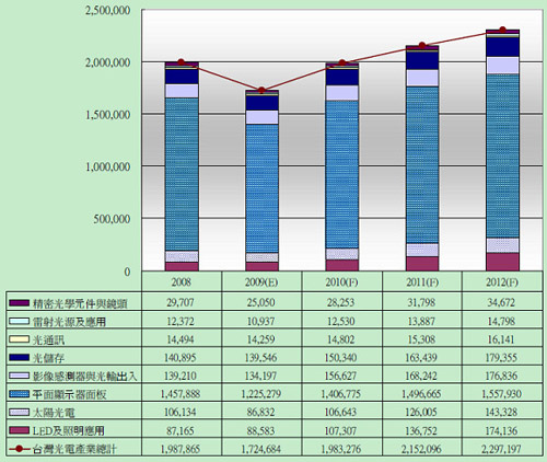 所幸景气在2009年第一季跌到谷底之后便开始逐步回升,至第四季才确定恢复热络的景象。但是台湾地区光电产业还是难抵金融风暴的余威,整体产值下滑了13%,到1兆7,247亿新台币。如原本所预估的,金融风暴会牺牲掉两年的成长率;保守预期台湾地区光电产业将于2010年重拾成长,再度站回接近2兆新台币之规模。