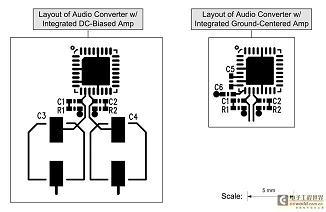 (1)最大限度地减少了PCB空间。图3给出了需要隔直电容的音频编解码器与集成了地居中放大器的音频编解码器的PCB布局图。