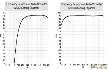 用来隔离DC电流的最常见技术是采用去耦电容,如图1所示。在信号路径中放置一个电容可以创建一个高通滤波器,其角频率由耳机阻抗(R)和去耦电容(C)设置,等于1/(2πRC)。通常人的耳朵能够听到声音频率最低为20Hz。根据这个下限和耳机的典型阻抗,可很容易地计算出所需的电容值。对于20Hz的角频率,电容容值取500uF。