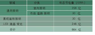 2008年我国发电总量34334亿千瓦时,我国照明用电约4000亿千瓦时,占全国电力消耗的12%,占全国能源消耗的5.9%在未来全面建设小康社会的过程中,照明用电仍将保持快速增长的态势,照明用电占全国电力消费总量的比重也必将持续提高。如按照明用电年增长率5%~10%,预计2015年照明用电5628亿~7795亿千瓦时。另根据《国际能源展望2006》预测,2015年全国发电量达45200亿千瓦时,我国照明用电将达到5800亿千瓦时以上。在此预测2015年我国照明用电量6000亿千瓦时。预计2015年LED产品光效将达到150lm/W(白炽灯为15lm/W,卤素灯20lm/W,荧光灯为90lm/W,高压钠灯120lm/W),LED照明产品将进入20%以上通用照明市场,70%以上景观装饰照明市场,经测算可年节电418亿千瓦时。LED背光将进入50%以上液晶电视市场、100%液晶显示器和笔记本电脑市场,可年节电246亿千瓦时,合计年总节电量664亿千瓦时。(见表1)