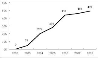 自2003年启动半导体照明工程和“十一五”863重大项目实施以来,我国LED外延材料、芯片制造、器件封装、荧光粉等方面均已显现具有自主技术产权的单元技术,部分核心技术具有原创性,初步形成了从上游材料、中游芯片制备、下游器件封装及集成应用的比较完整的研发与产业体系,为我国LED产业做大做强在一定程度上奠定了基础。目前我国芯片企业产业化线上完成的功率型芯片封装后光效超过90lm/W。具有自主知识产权的功率型硅衬底led芯片封装后光效达到78lm/W,处于国际先进水平。根据国家半导体照明工程研发及产业联盟统计,从2004年开始国内LED产业累计新增投资规模达150亿元,最近连续3年,每年企业订购并安装投入的MOCVD数量超过50台以上,国产化率大幅提高,截止2008年底,芯片国产化率达到49%(见图1)。按照目前联盟成员单位的扩产计划和机台订单数量,预计未来3年国内将增加MOCVD近两百台。目前Cree、旭明以及台湾芯片厂商都以合资的形式进入了国内,势必进一步带动芯片的国产化。2015年芯片国产化率有可能达到70%。
