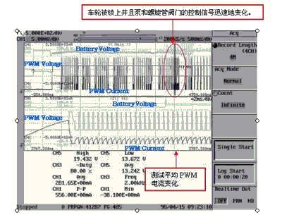 接着再次迅速提高盘式液压,通过ABS传动装置增加制动力。换句话说,可通过增减盘式液压防止制动器被锁上。增加盘式液压也就是用泵将液体压入汽缸,会使泵马达迅速工作。这个快速的马达将影响控制螺旋管阀门的PWM电流信号。一般ABS操作无法得到这是否影响电池电压波动。因此,有必要观察这个电池电压波动。