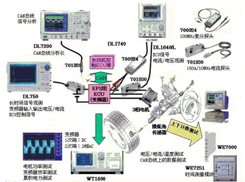 动力方向盘(EPS)在小型汽车中应用已经比较普及了,但在需大扭矩的大型车中应用时需要采用3相电机.不同于传统的DC机,测试3相交流电机需要功率计测试电力及效率.此外,ECU间采用CAN总线通信,还必须测试CAN总线信号。