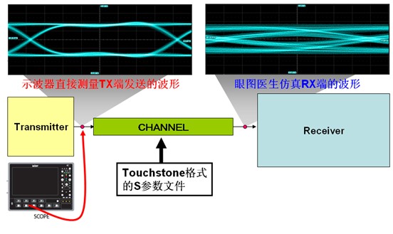 眼图医生(Eye Doctor)是力科于2006年推出的用于高速串行数字电路设计的强大工具,集成在高带宽示波器中,包括了虚拟探测(virtual probing)与接收端均衡(receiver equalization)两部分,主要用于通讯背板设计、高速串行信号一致性测试、高速SERDES芯片均衡器的优化与设计等等。在2009年2月,力科发布了新一代的眼图医生II,提供了更强大的分析能力与良好人机界面。如下图1所示,利用Eye Doctor的信道仿真功能,可以用示波器测量到的TX端发送的波形,在Eye Doctor II中导入信道的S参数模型文件,计算出通过信道后RX端的信号波形、眼图与抖动,其功能类似于EDA的SI仿真工具。