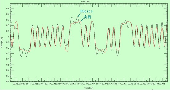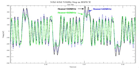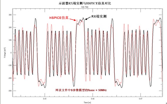 在图9中分别为fbase=30/40/50MHz时,HSPICE仿真出的接收端波形??梢钥吹絝base=50MHz时,低频的码型(长1或长0)幅度较低些,与实测RX端波形的比较接近。在使用HSPICE仿真时,fbase=50MHz时的仿真时间远小于最开始的频率设置(fbase = 10MHz)。在图10中,对比了fbase=50MHz时HSPICE仿真的RX端波形与实测波形,两者一致性比较好。