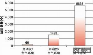 图1显示出三种不同组装工艺的良品率情况。由图可见,使用免清洗焊膏在空气环境下进行回流焊产生的不良最少,总数为66个;使用水溶性焊膏在空气环境下进行回流焊次之,不良有1,499个;使用免清洗型焊膏在充氮环境下进行回流焊产生的不良数最多,为5,665个。图3还表明在充氮环境下以及焊膏助焊成分活性增大(水溶性焊膏)时,产生的不良数目会增多。