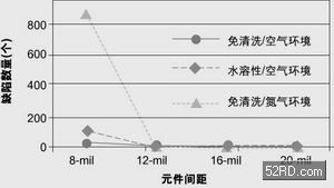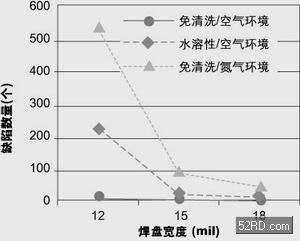 图2是三种不同组装工艺中锡桥与元件间隔之间的关系。从图中看出,元件间隔在0.012英寸或更大时没有发生任何锡桥。免清洗焊膏在空气环境中焊接产生的锡桥数量最少,为14个;水溶性焊膏在空气环境中焊接产生的桥接数量排在第二,为99个;而免清洗焊膏在充氮环境中焊接产生的桥接数量最多,有866个。此外在最小的0.008英寸间距下,用免清洗焊膏在空气环境焊接时18种焊盘中有12种焊盘没有产生任何锡桥,用水溶性焊膏在空气环境中焊接时有10种焊盘没有锡桥,而使用免清洗焊膏在充氮环境中焊接时只有6种焊盘没有产生锡桥。