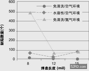 图3给出了焊点缺陷数量与焊盘长度及组装工艺的关系。与前一张图类似,这些数据也是在每种组装工艺选用最佳焊盘形式时得出,试验将焊盘宽度和焊盘间距设为常量,只对焊盘长度进行变化。从图上我们可以看到,对所有三种组装工艺而言最佳焊盘长度都是0.012这个中间值,通常来说焊盘长度在0.008到0.012英寸之间对良品率的影响最大。从组装工艺方面来看,免清洗焊膏在充氮环境下焊接对造成不良的影响最为敏感,比其他工艺更容易受焊盘长度的影响。使用免清洗焊膏在空气中焊接时,焊盘长度为0.012英寸和0.016英寸均没有发现任何焊点缺陷。