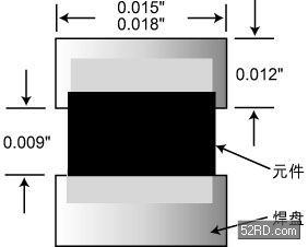 图4给出批量进行0201元件回流焊时的元件焊盘设计建议。建议两焊盘间距0.009英寸,焊盘长度0.012英寸,宽度在0.015英寸到0.018英寸之间,具体取决于助焊剂成分类型和焊膏回流焊环境。0.018英寸宽度适用于充氮焊接环境、氧气含量很低(50ppm以下)以及焊剂活性很强或润湿时间很短的情况;而0.015英寸宽度焊盘则适用于在空气环境中进行回流焊接、焊膏溶剂活性较弱以及有较长的润湿时间等情况。
