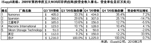 下表所示为iSuppli公司对于2009年第四季度按营业收入排序的五大NOR闪存供应商排名。
