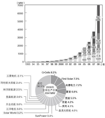 - 全球太阳电池产量急增, 2008年比上年大幅成长了87%,达到6941MW