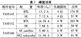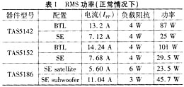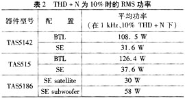 TexasInstruments还提供具有数字增益控制功能的RMS功率测量方式,使THD+N≤10%。利用TI公司的TAS5508或TAS5086型调制器,可以实现数字增益。THD+N为10%时的平均功率要高于正常FTC的THD+N<1%时的额定功率。表2列出了THD+N为10%时的平均功率。