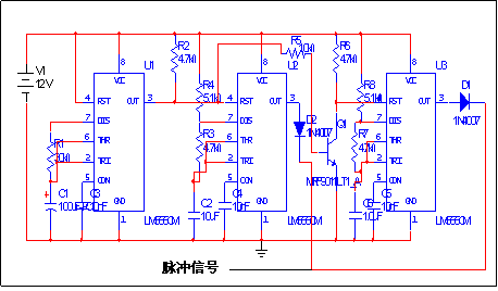 充电电路与脉冲信号结合,对电路进行充电。这里的脉冲信号可用555定时器来实现,用3个555来构成一个频率在周期变化的脉冲信号。电路图如图。