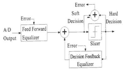 - 判决反馈均衡器Decision feedback equalization (DFE):根据解码数据改变信号的幅度,一个经典的判决反馈均衡器的结构如图3所示。