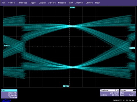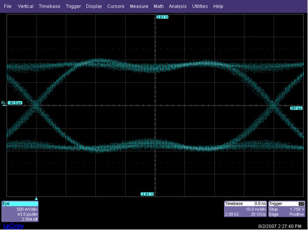 2、接收端信号波形和眼图信号经过背板和连接器,到达接收端,信号变差,眼图变小,如图8、图9所示。如果不使用均衡技术,系统很容易出现误码,因此在高速接收芯片内部通常需要嵌入均衡器。