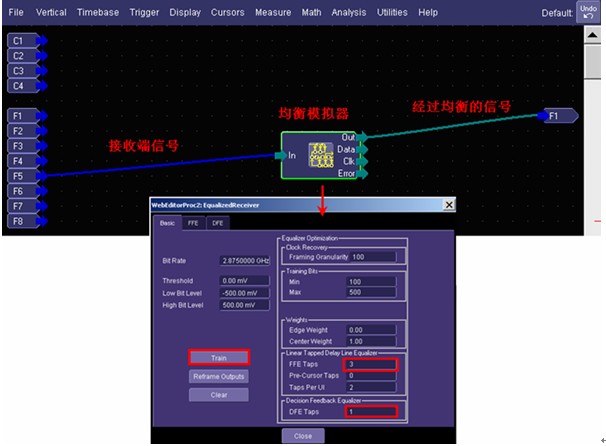 4、均衡模拟器把经过背板的已衰减信号加到示波器的均衡模拟器上,查看经过均衡的信号眼图。根据接收芯片实际情况,我们把FFE和DFE的抽头数分别设为3和1,点击Train,对均衡器进行训练(图12),就得到了均衡后的信号,其眼图如图13所示。