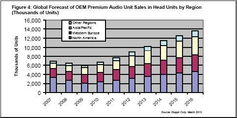 据iSuppli公司,在2009年下滑之后,全球车用高端音响系统的出货量在2010年将以两位数速度增长,从而为该市场在2016年翻倍铺平道路。