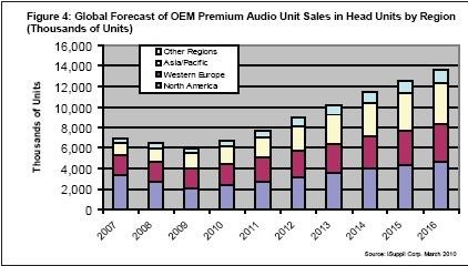 - 全球车用高端音响系统的出货量在2010年将以两位数速度增长