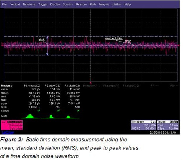 让我们从大部分基本测量开始。Figure 2中我们做了带宽受限噪声波形的时域测量。通过使用测量参数取得了噪声信号特征的一些认识。大多数有意义的参数是波形的平均值,标准方差,峰峰值。这些测量的标准方差,可以描述为交流有效值,被看作成波形的有效值是非常有用的。参数统计可显示平均值,最大值,最小值,标准方差,统计的测量值数量。读出参数下的小直方图称为histicons,显示了相关参数测量值的分布。
