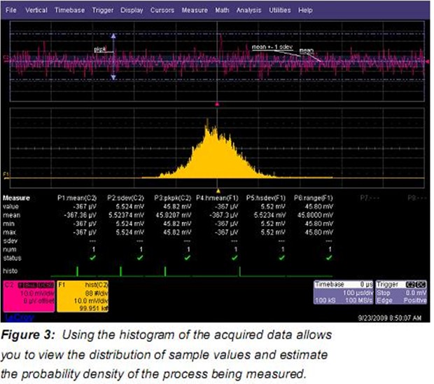 噪声呈高斯分布,平均值和标准方差用来描述噪声的概率密度函数(pdf)。直方图提供了测量参数分布的简单视图。Figure 3 显示了采集样本值的直方图。该直方图为用户提供了带有被测过程的概率密度函数的估计。这个数据可以使用直方图参数解释。Figure 3 显示了3个直方图参数,hmean,hsdev,和range,分别是平均值,标准方差,范围的直方图分布。直方图可由单次采样或多次采样计算出来。这两种情况都能提供被研究过程的大量本质认识。这个例子中的伪高斯分布表明信号源是一个随机过程。