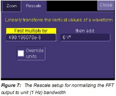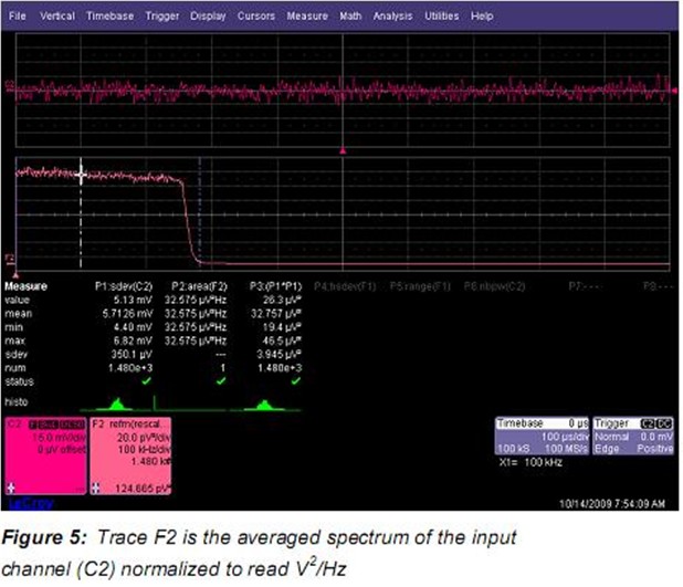 在重标刻度后,F2中的FFT的垂直单位是 V2√Hz。通过对FFT迹线以下的区域积分可以确认重标刻度的正确性。Figure 5中用门限到用来限制噪声源带宽的滤波器的噪声带宽的区域参数来实现,该处是280kHz。F2以下的区域是平均平方值, 32.575 E-6 V2。可以和C2中波形的平均平方值(变量)计算所得的参数P3 32.575 E-6 V2比较。
