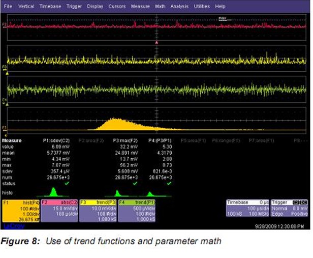 参数统计包括最小和最大值。如果想查看采集接着采集的参数变化可以使用趋势功能。趋势绘出了每个测量值vs 顺序事件数的变化。Figure 8中显示的函数迹线F4就是参数P1的趋势。P1是通道C2的标准方差。标准方差参数每一次采集产生一个值,而F4顺序显示测量到的每一个读数。趋势图可以看成一种任意波形,可以使用任何数学或测量工具对其分析。
