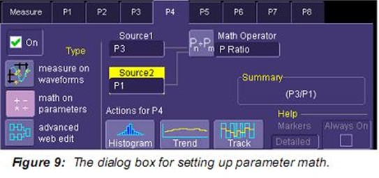另一个关注的噪声参数是峰值系数,峰值对有效值的比率。这个决定动态范围的参数需要处理信号中的峰值变化。示波器没有双“峰”参数,但可以通过采用通道 C2的绝对值从而创建一个。将负值“翻转”到波形的正上方以便用户使用参数最大值读取每个采集最大的正或负峰值。注意该处理因为信号具有0平均。使用参数数学计算峰值系数。参数数学设置如Figure 9所示,计算P3对P1的峰值系数P4。Figure 8中所示峰值系数平均值为4.3。