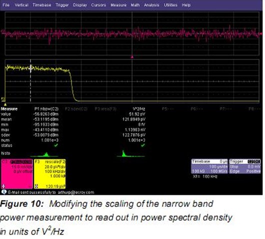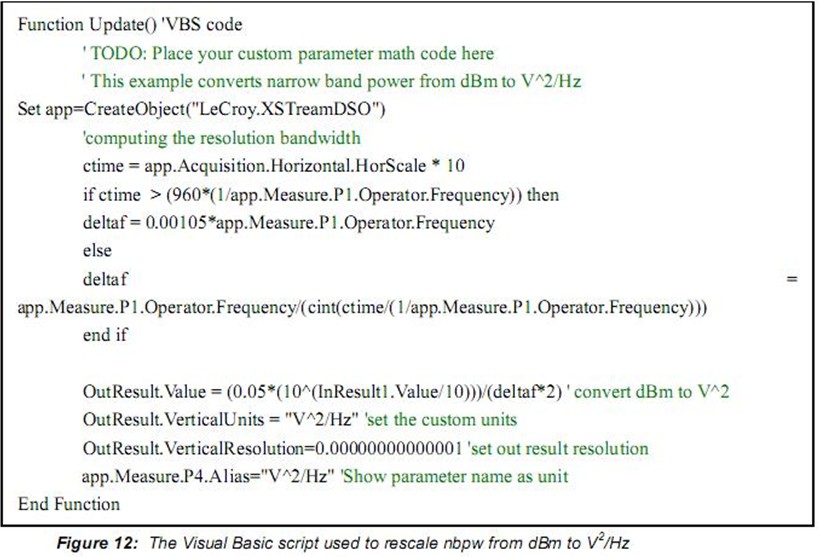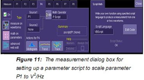 另一个进行噪声“点”测量的方法是采用可选的窄带功率测量。窄带功率(nbpw)通过计算给定频率上的离散傅里叶变换测量功率。Nbpw的单位是dBm。噪声测量不太方便,我们希望用噪声功率谱密度线性单位V2√Hz来进行测量。幸运的是,力科示波器可以用脚本使用参数数学修改测量。这允许更复杂的计算而不是Figure 9所示的参数的简单比率峰值系数。