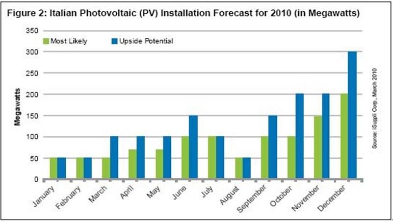 最可能出现的情况是,2010年意大利市场将安装1.1GW,年终的四个月需求将会大增。但是,由于将下调FIT,意大利2010年安装容量也很有可能高达1.5GW。