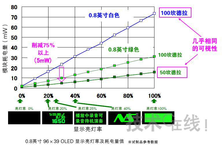 此次开发的有机EL面板的耗电量“与配备LED背照灯的液晶面板相当”。日本精机首先试制了0.8英寸的绿色面板,与该公司原来同尺寸面板相比,“可视性几乎相同,耗电量削减了75%”(日本精机)。该公司计划利用此次的有机EL面板低耗电技术,推动有机EL面板的普及。