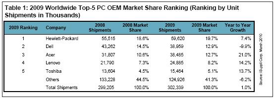 从2009年全年来看,五大PC OEM厂商中有四家增长率高于整体产业。最大厂商惠普增长7.4%。宏基、联想和东芝分别排是第三、第四和第五大厂商,分别增长21%、14.2%和13.7%。排名第二的戴尔出货量下降。