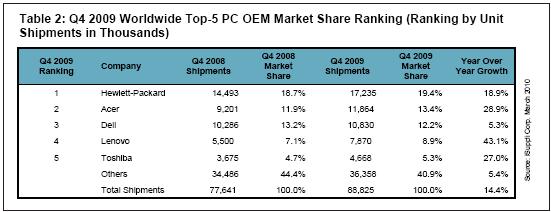 2009年第四季度,五大PC厂商的排名与第三季度相同。