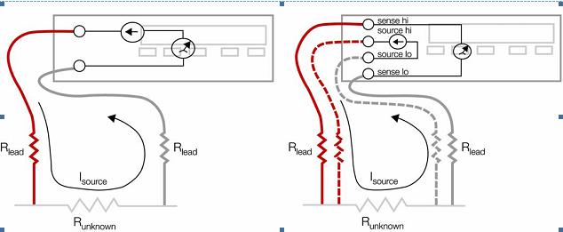 源端引线中的串联电阻不影响电流流动。测量/传感引线几乎没有电流流动,因为仪表的输入阻抗很高。这意味着测量引线中没有I x R电压下跌。因此,您只需测量由于流经的源电流而在未知电阻器中产生的电压下跌。