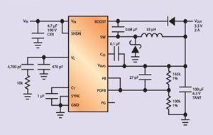 在猝发模式下,它的静态电流低于100礎,适合输入电压为12V至3.3V的产品。这个器件采用厚度很薄的TSSOP封装,热阻非常小,适合尺寸很小的设计。最后,它使用了电流模式电路,具有良好的瞬态响应,容易补偿,并且使用一种拥有专利权的电路,在占空比为任何数值时保持开关中的峰值电流恒定。它的开关频率是固定的200kHz,此外,这个产品可以同更高的频率同步。在整个汽车的温度范围内,它的稳压性能很好,并且提供电源正常信号/复位、软启动和UVLO功能。这个电路是一个可靠的、高效率的降压转换器解决办法,电流高达2.5A,尺寸很小,适合汽车使用。