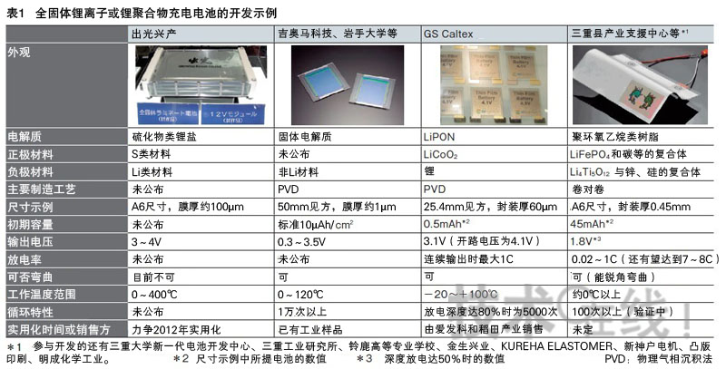 表1:全固体锂离子或锂聚合物充电电池的开发示例