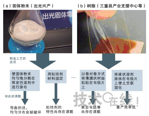 出光兴产正在研究借助硫化物类粉末来形成均一电解质层的方法(a)。三重县产业支援中心等为了降低电解质与电极片之间的表面电阻,目前正在研究在电极片上涂抹树脂溶液后,通过交联形成高分子的方法(b)。 三重县产业支援中心使用树脂作为电解质。由于是“非凝胶状的无漏液干树脂”(该中心高级部件技术革新中心业务总负责人伊坪明),因此适于以卷对卷方式进行量产。不过,在实用化方面还存在需要攻克的课题。该中心“将努力通过降低表面电阻使输出电压提高至目前的两倍”(伊坪明),目前正在研究向电极片涂抹溶液状树脂使之交联固化的方法。